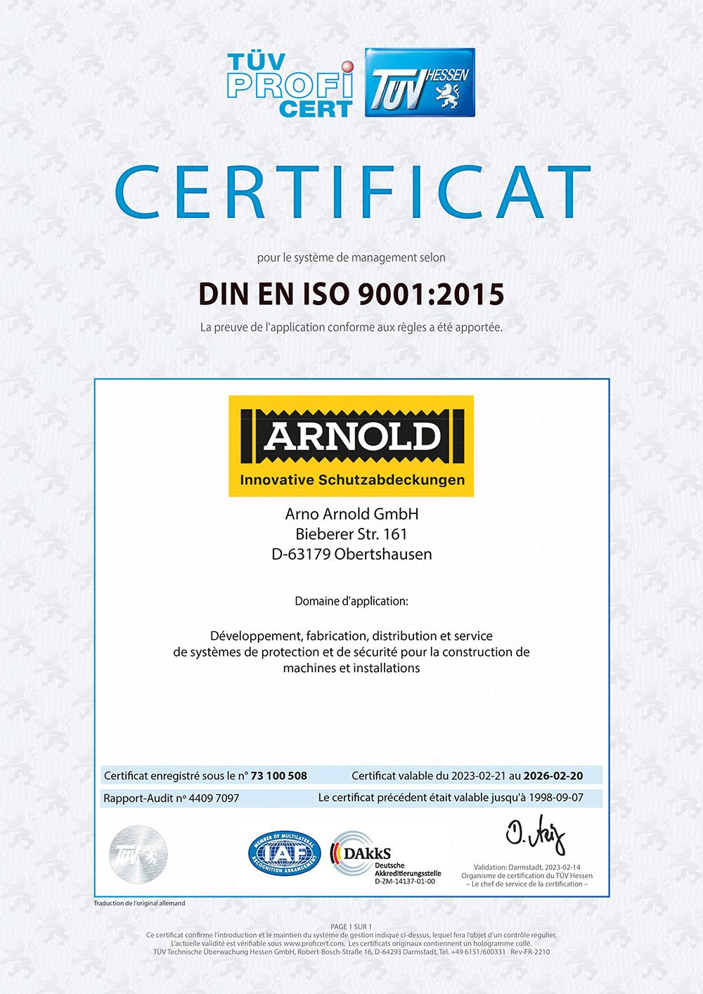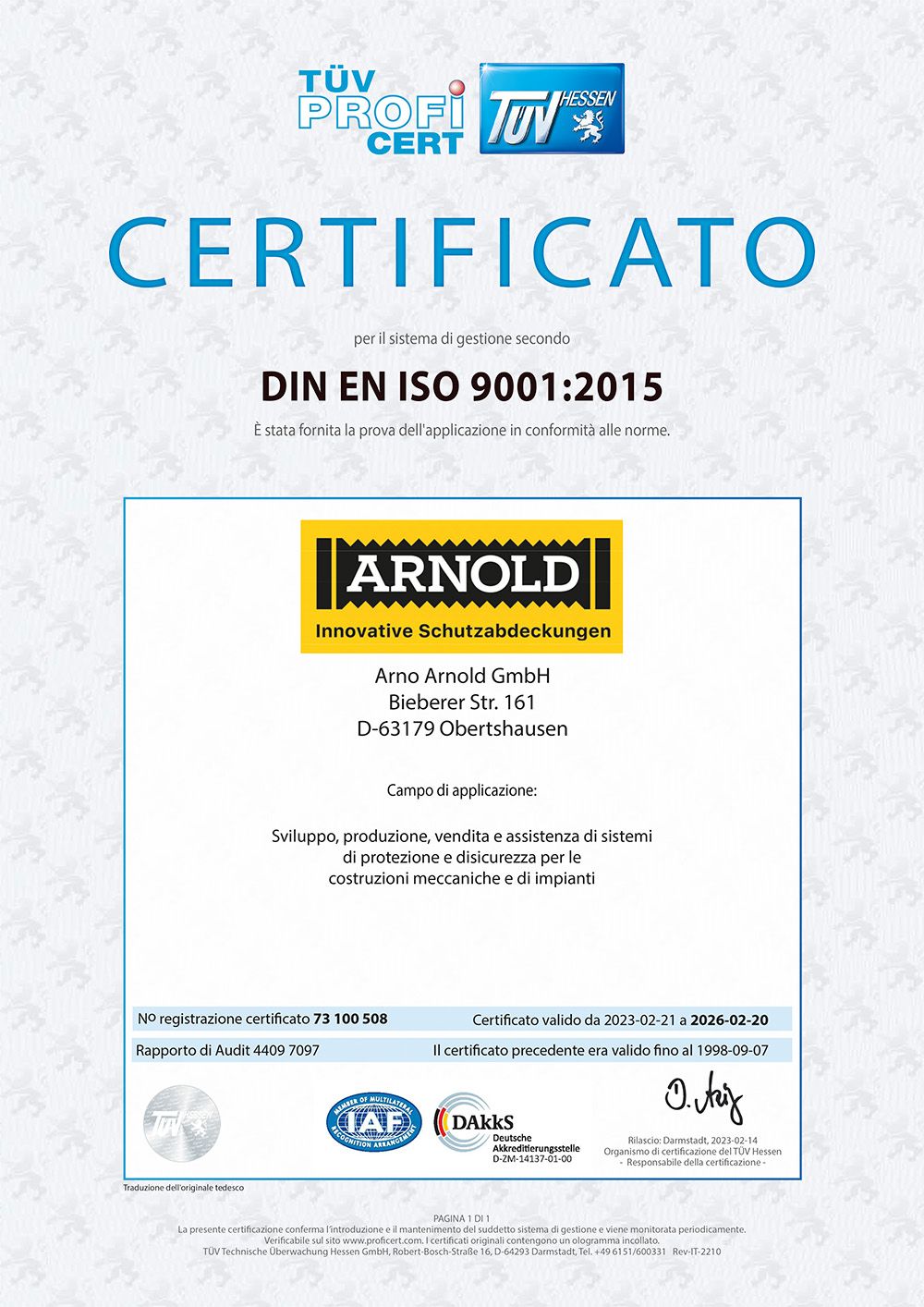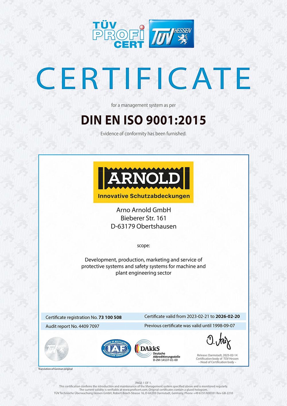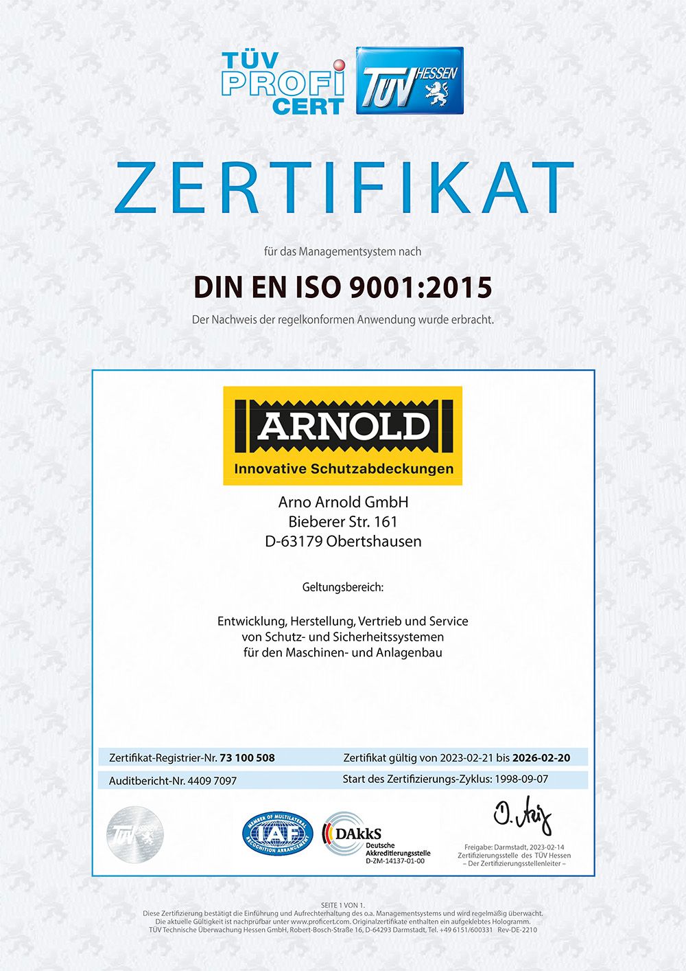 Arno Arnold hat den Nachweis der regelmäßigen Anwendung für das Qualitätsmanagementsystem nach DIN EN ISO 9001:2015 am 20.3.2017 erbracht. Dies wurde vom TÜV Hessen gemäß TÜV PROFICERT-Verfahren bescheinigt.